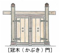 門は明治時代以前には武家や寺院または豪農・豪商等限られた身分の人々しか作ることが出来ず、庶民には門を作ることが許されていなかったようです。江戸時代から明治時代にかけて、東京では冠木門と呼ばれる屋根のない2本の門柱の上部を貫く横木(冠木)を渡した門が多く見られ、屋根がなく2本柱の門では単調すぎたため、それを補う目的で左または右側の門柱に添わせて下枝の一部を差し枝風に正門の上に伸ばし植えられたものが起源であると言われています。古くからの植栽方法の一つで、今日でも需要が多く、門冠り用に差し枝を伸ばした樹種も売品として栽培されています。(東京農業大学造園用語辞典参考)