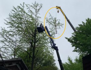 社員通信 ツリークライミング技術とリギングテクニック(枝や幹をコントロールしながら吊り下ろす技術)による高木越境枝の剪定作業