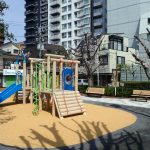 立会川駅の西側、第一京浜から100mほど入ったところにある。東大井3丁目の公園改修工事である。築山に設置された老朽化したスベリ台・木製複合遊具・ブランコ等を撤去して、新たに曲線が特徴的な土留めと一体化した傾斜遊具等、全面改修を行った。搬入路が狭かっため、搬入出車両は小型車両となり作業効率は低下したが、事故もなく無事に工事を完成できた。